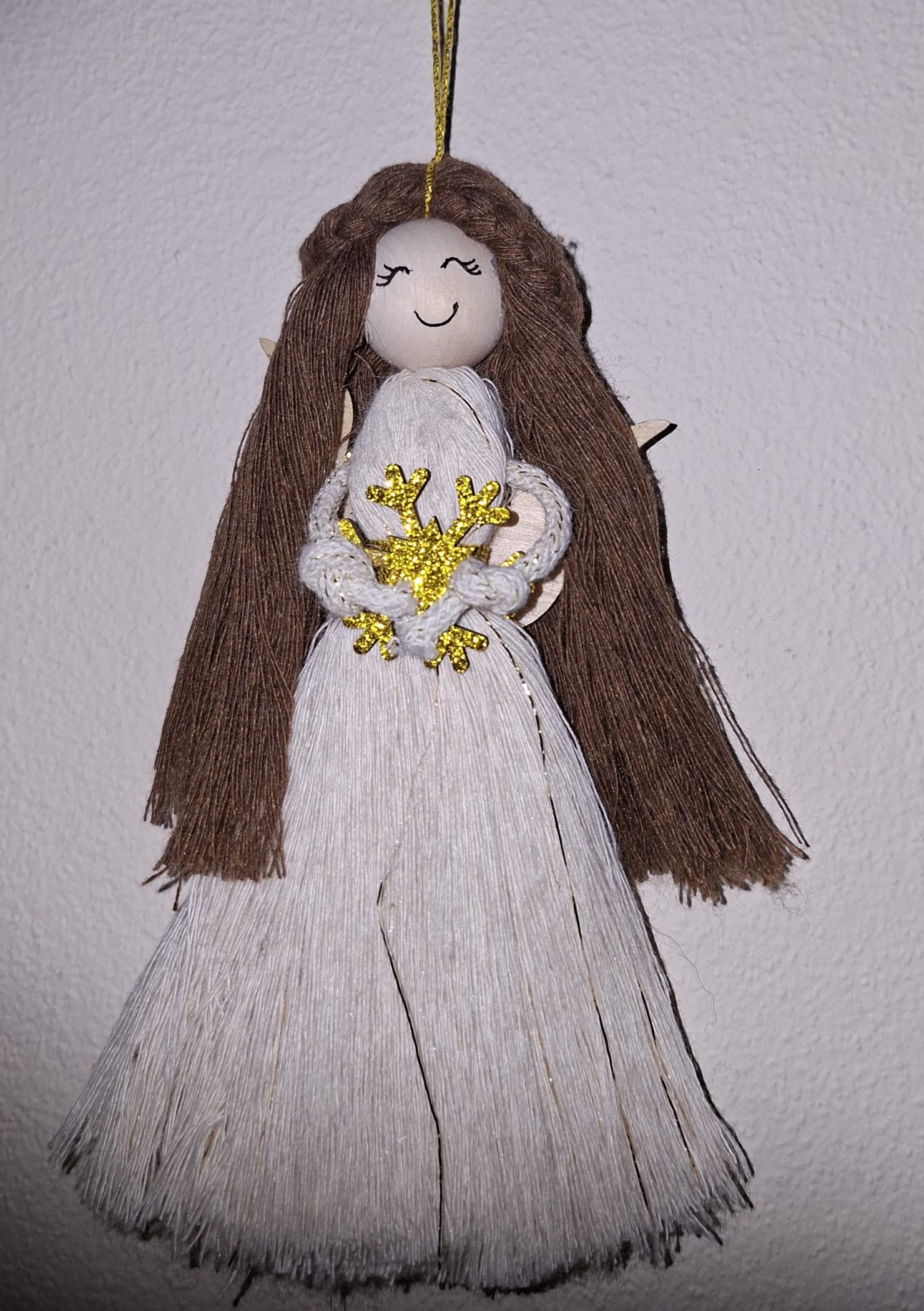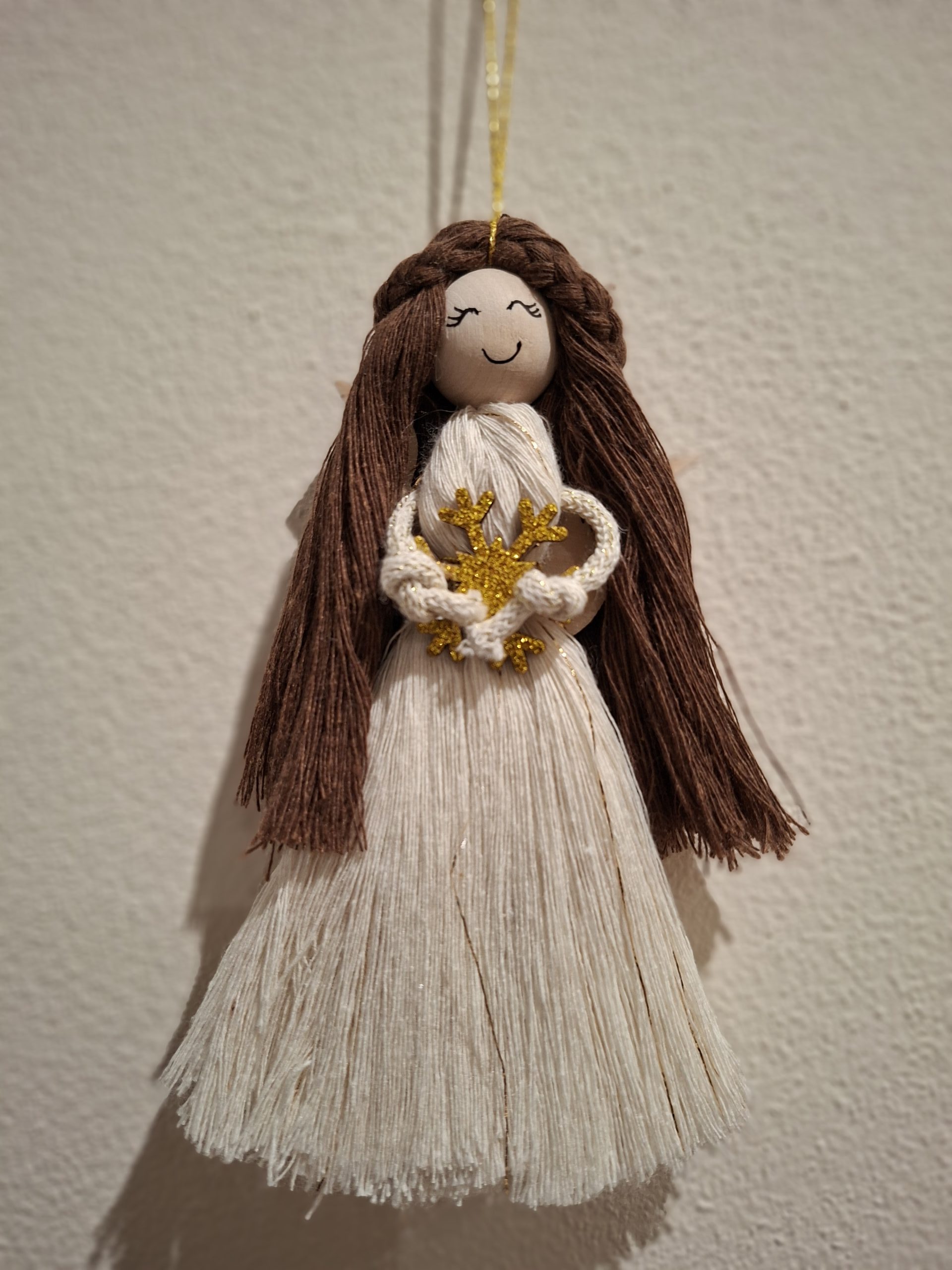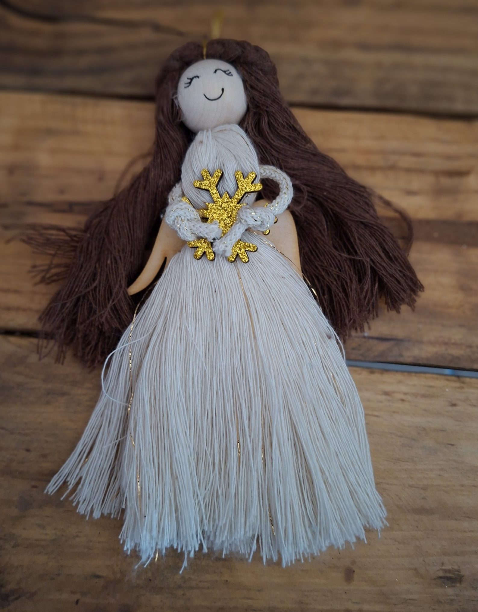 Ręcznie wykonany aniołek z makramy w naturalnych odcieniach ecru i brązu, ozdobiony złotym sercem. Subtelna, symboliczna dekoracja idealna na prezent świąteczny, pamiątkę lub elegancki dodatek do wnętrza. Lekki, starannie wykonany, gotowy do zawieszenia.
