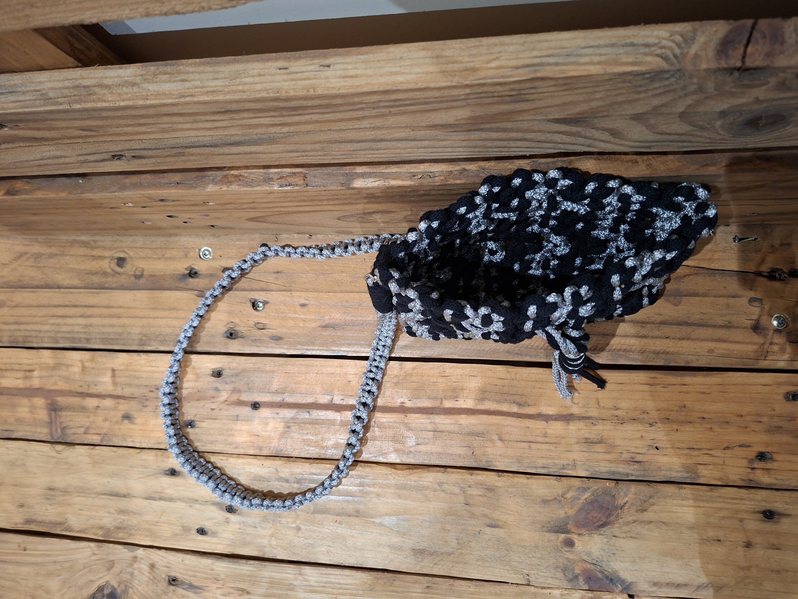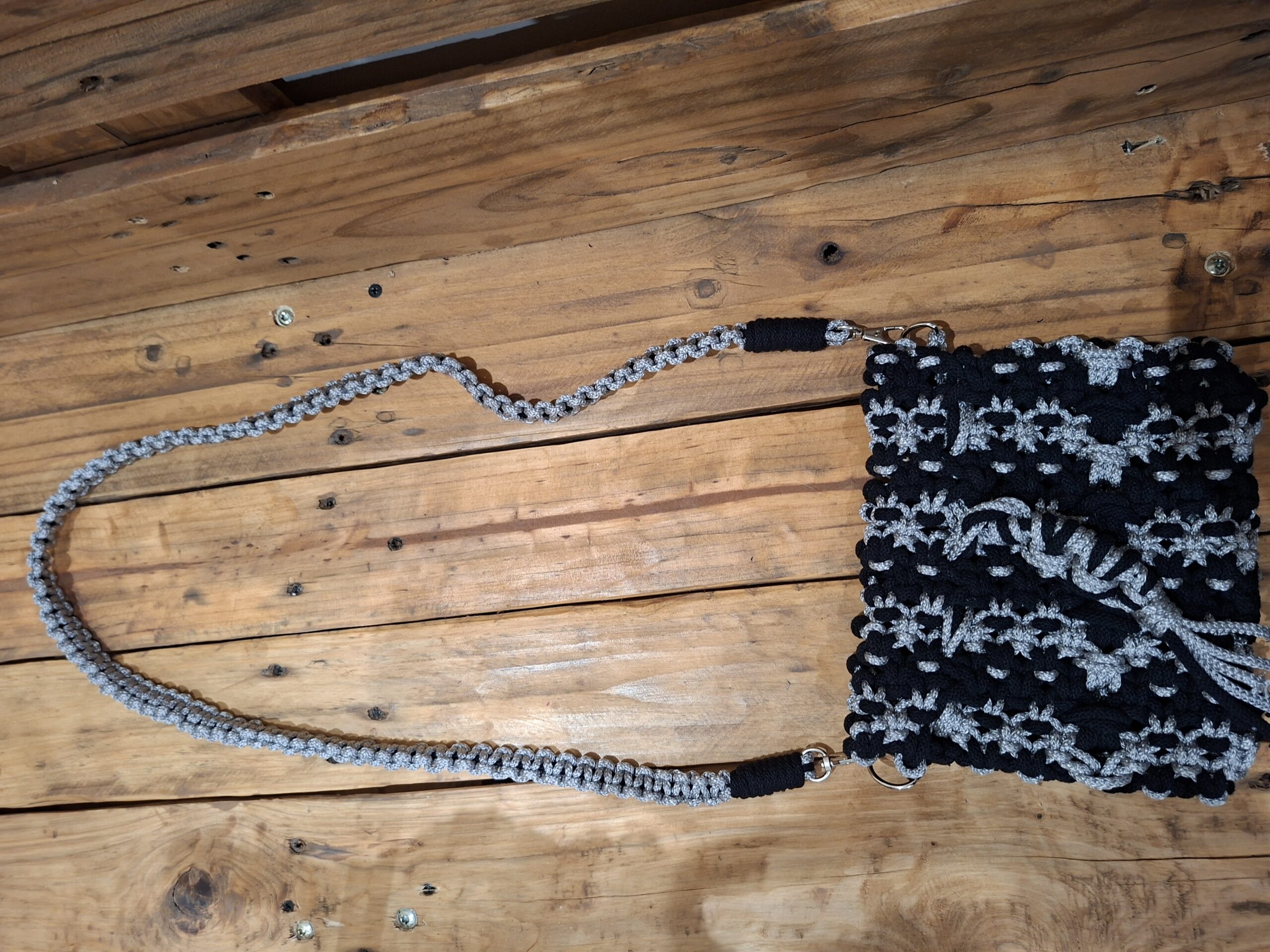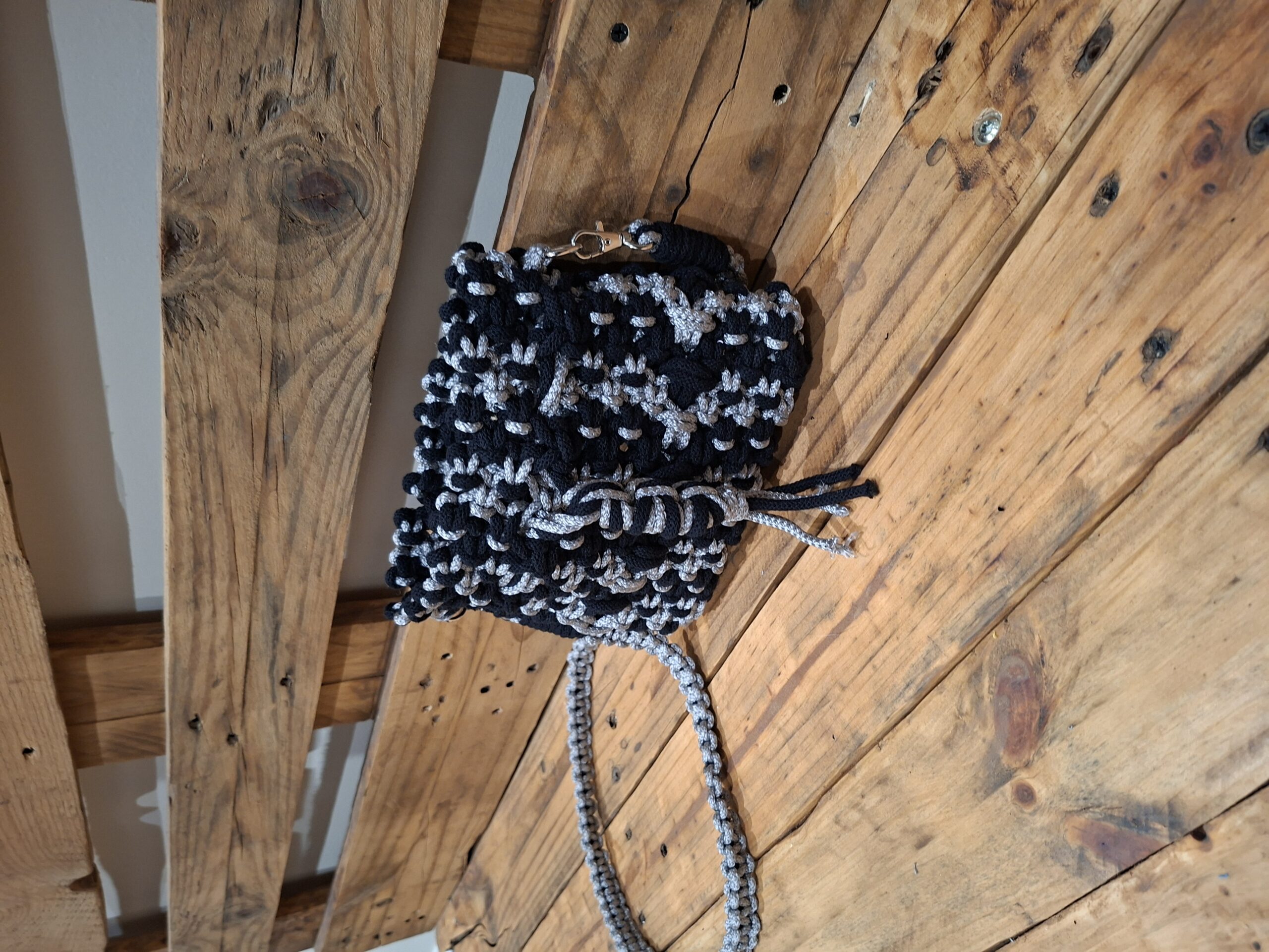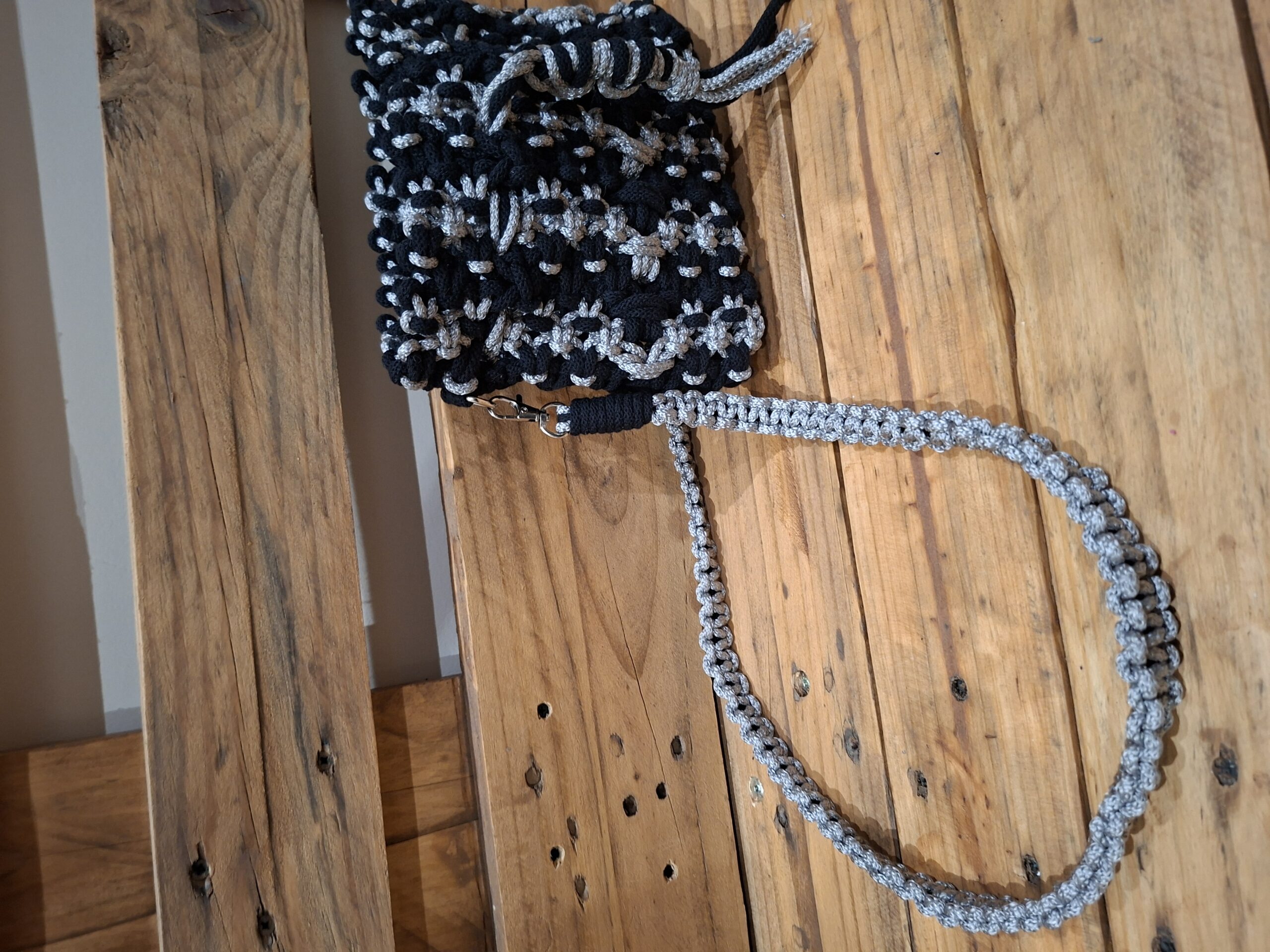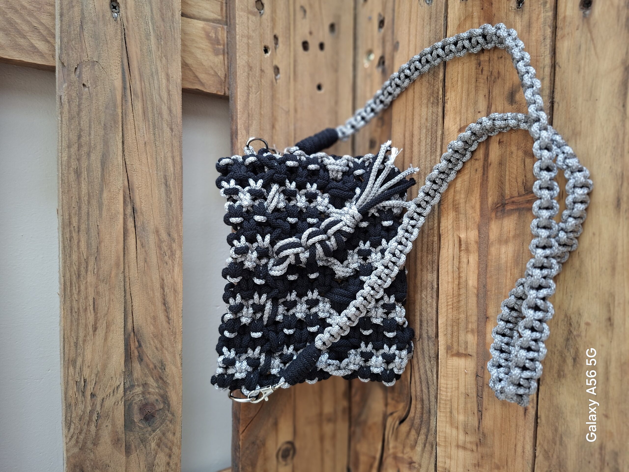 Stylowa, ręcznie pleciona torebka makramowa w wyjątkowym połączeniu sznurka odcienia czerni i srebra. Lekka, wygodna i pełna uroku – idealna na spacery i codzienne wyjścia. Każda torebka jest unikalnym egzemplarzem, stworzonym z dbałością o każdy detal. To idealny dodatek na spacer po mieście czy spotkanie z przyjaciółmi. Łączy w sobie naturalny urok i modny design, pasując do każdej stylizacji. Idealna na prezent dla miłośniczki stylu boho i handmade