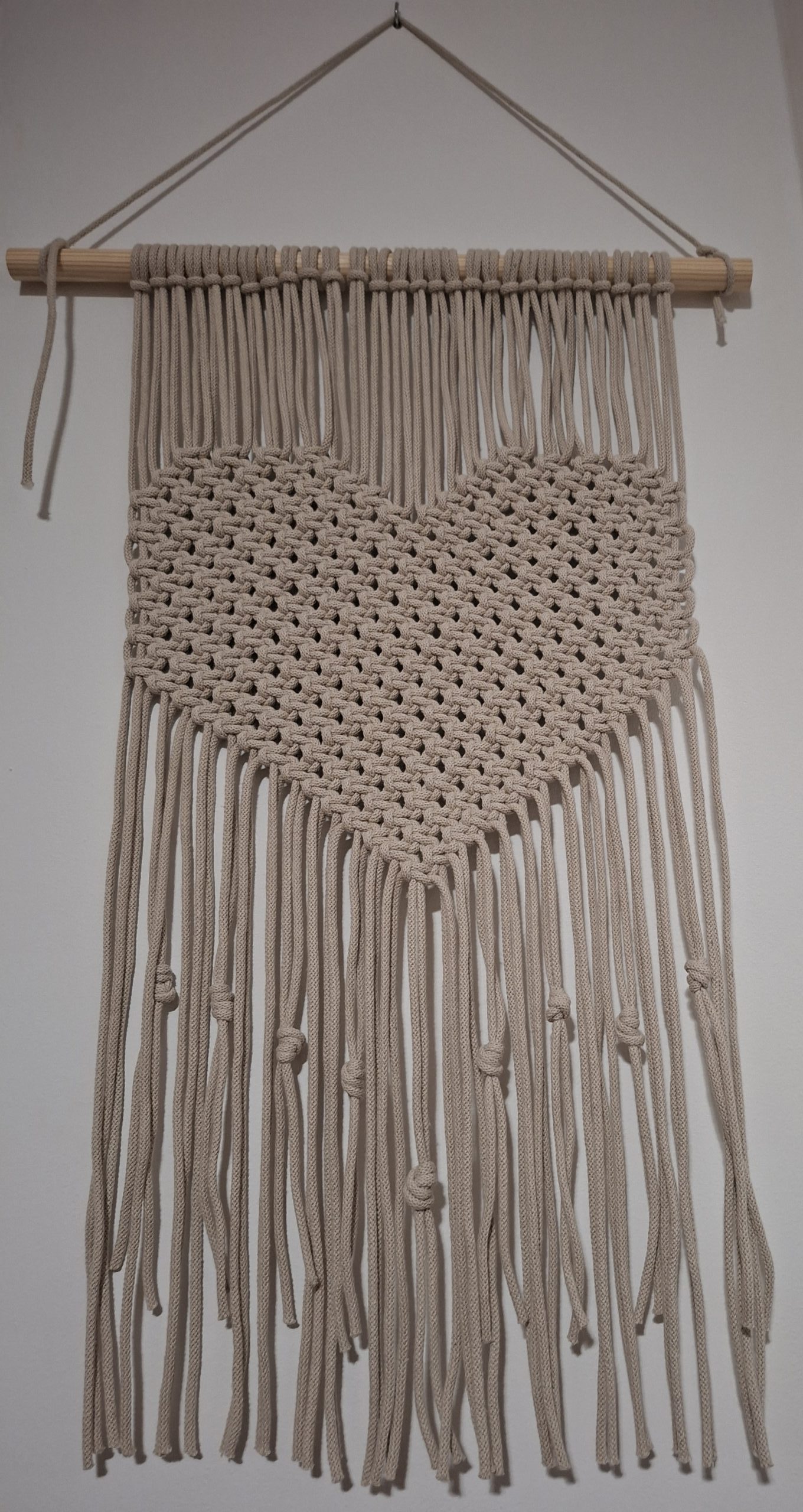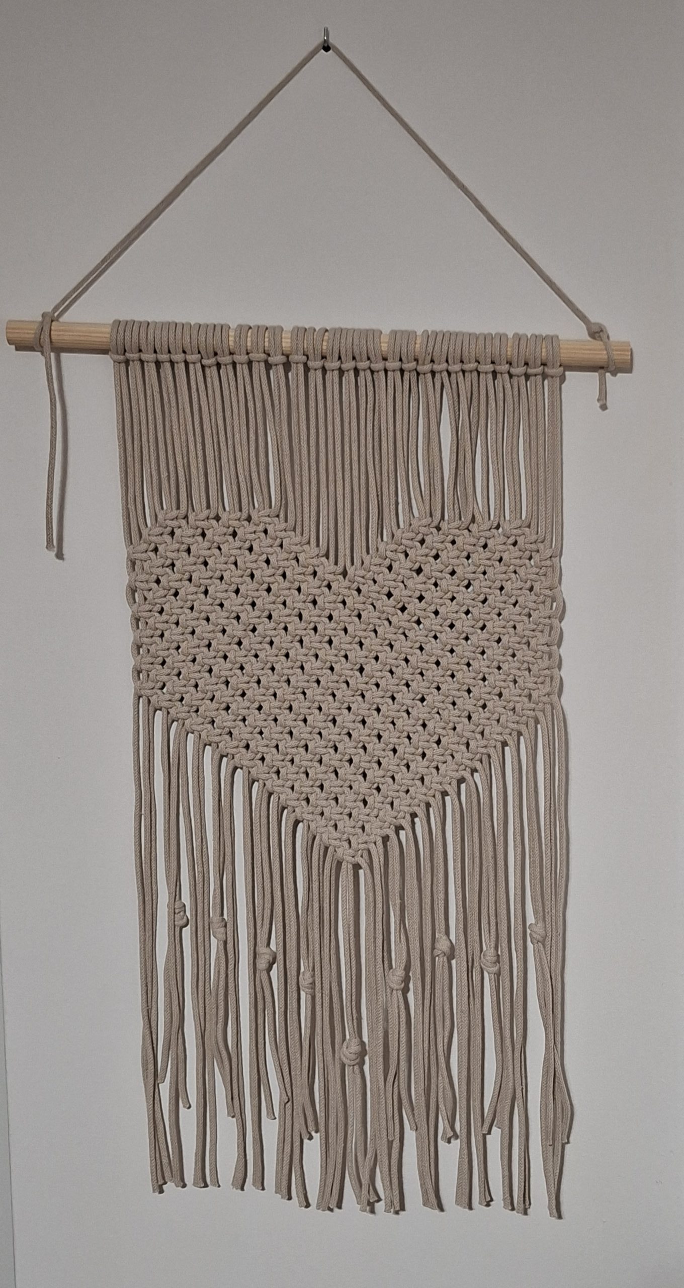 Ta makrama doda wnętrzu charakteru, ciepła i naturalności. To piękna dekoracja ścienna, która przyciąga wzrok subtelną strukturą i geometrycznym wzorem.