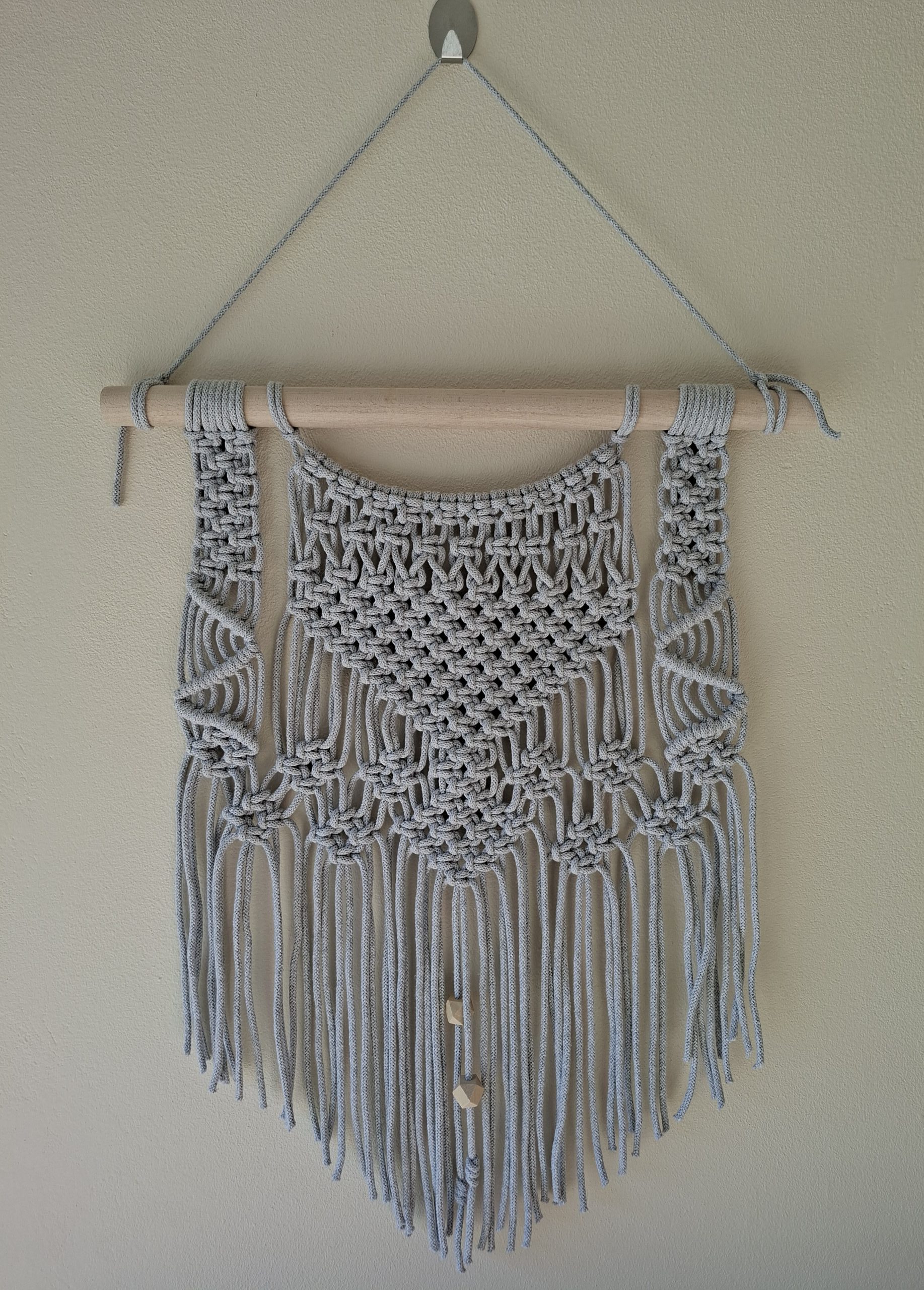 Nadaj swojemu wnętrzu wyjątkowego charakteru dzięki tej ręcznie wykonanej makramie w odcieniu delikatnej szarości. To idealny element wystroju w stylu boho, skandynawskim lub minimalistycznym – wprowadzi spokój, harmonię i naturalny urok do każdego pomieszczenia.