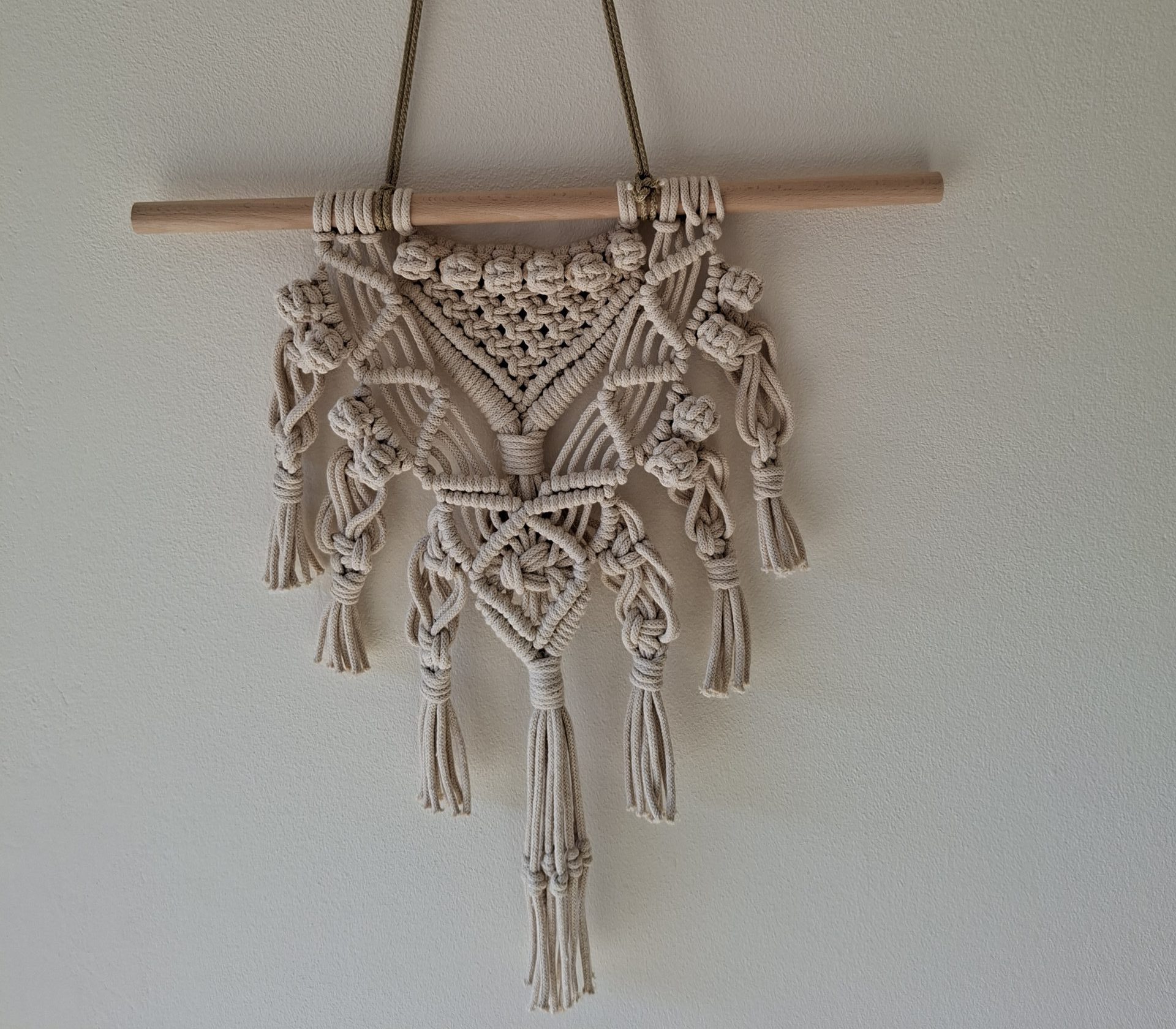 Dodaj ciepła i przytulności swojemu wnętrzu dzięki tej ręcznie wykonanej makramie ściennej. Idealna do salonu, sypialni, korytarza lub biura – wprowadza naturalny, boho klimat i pasuje do każdego stylu.