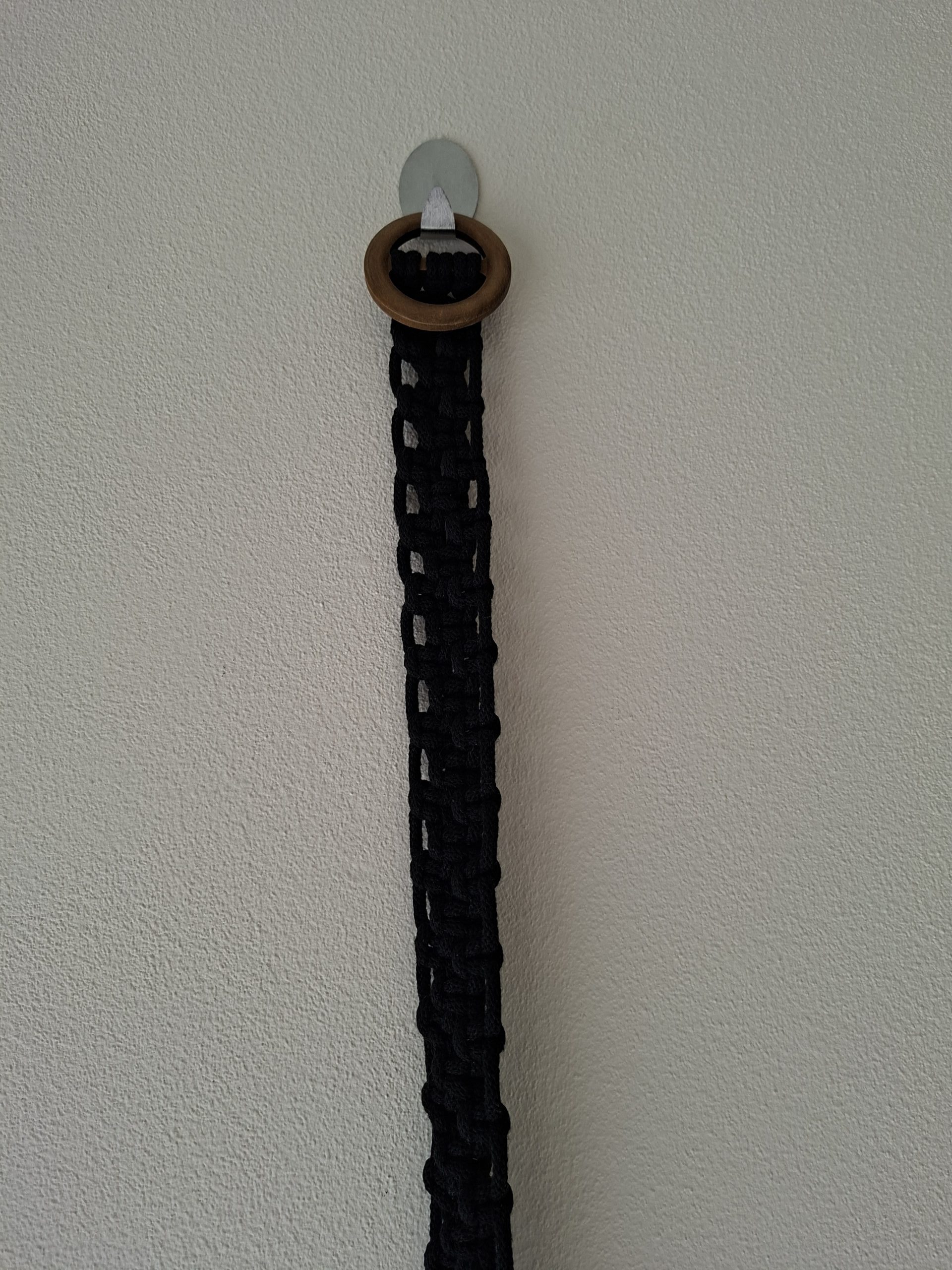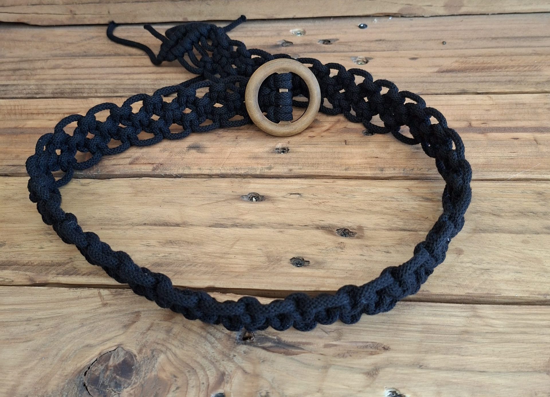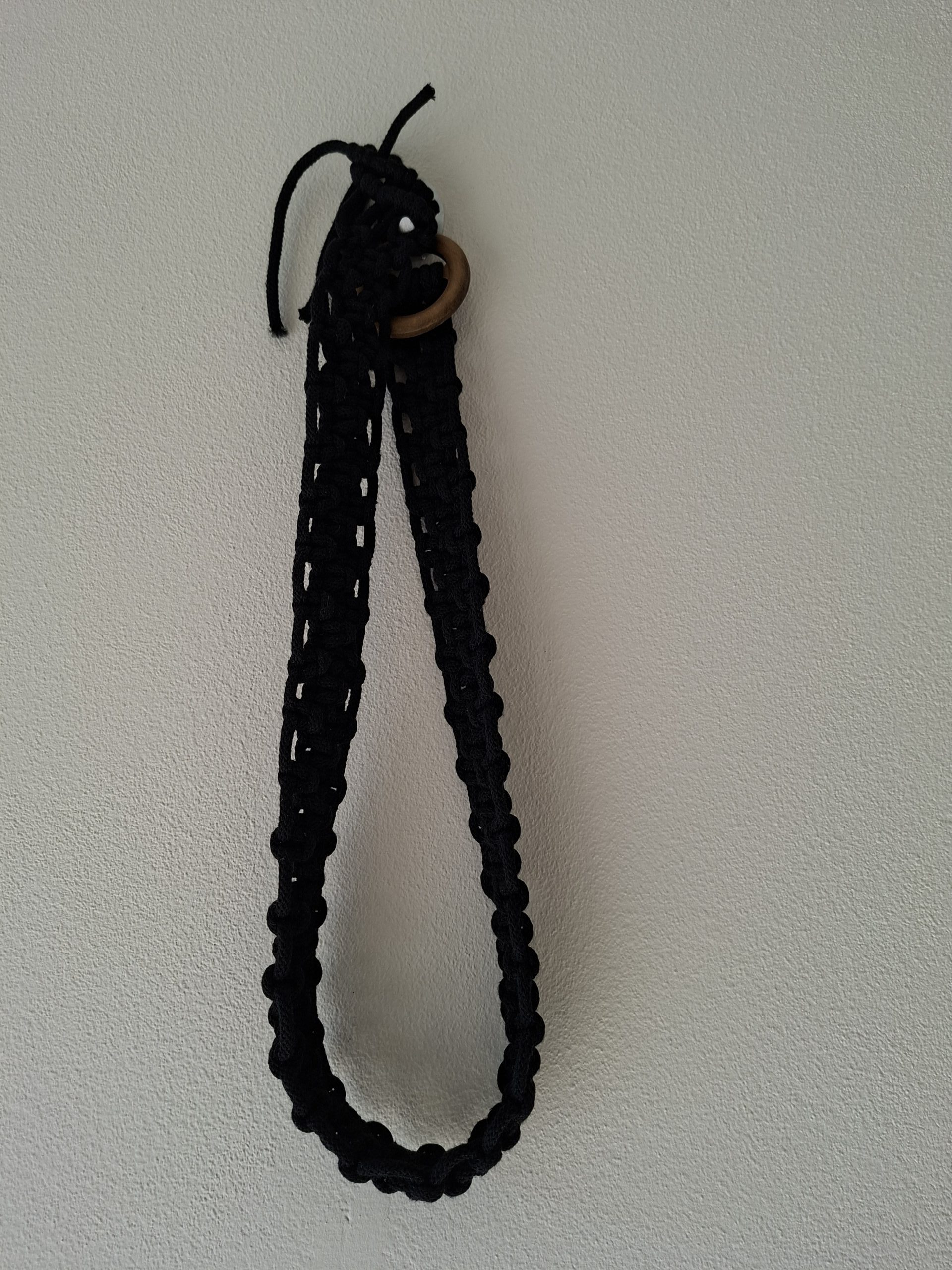 Stylowy i minimalistyczny dodatek wykonany ręcznie techniką makramy. Ten czarny pleciony pasek świetnie sprawdzi się jako element dekoracyjny do wielu kreacji. Dzięki solidnemu splotowi i drewnianemu kółku jest zarówno praktyczny, jak i estetyczny.