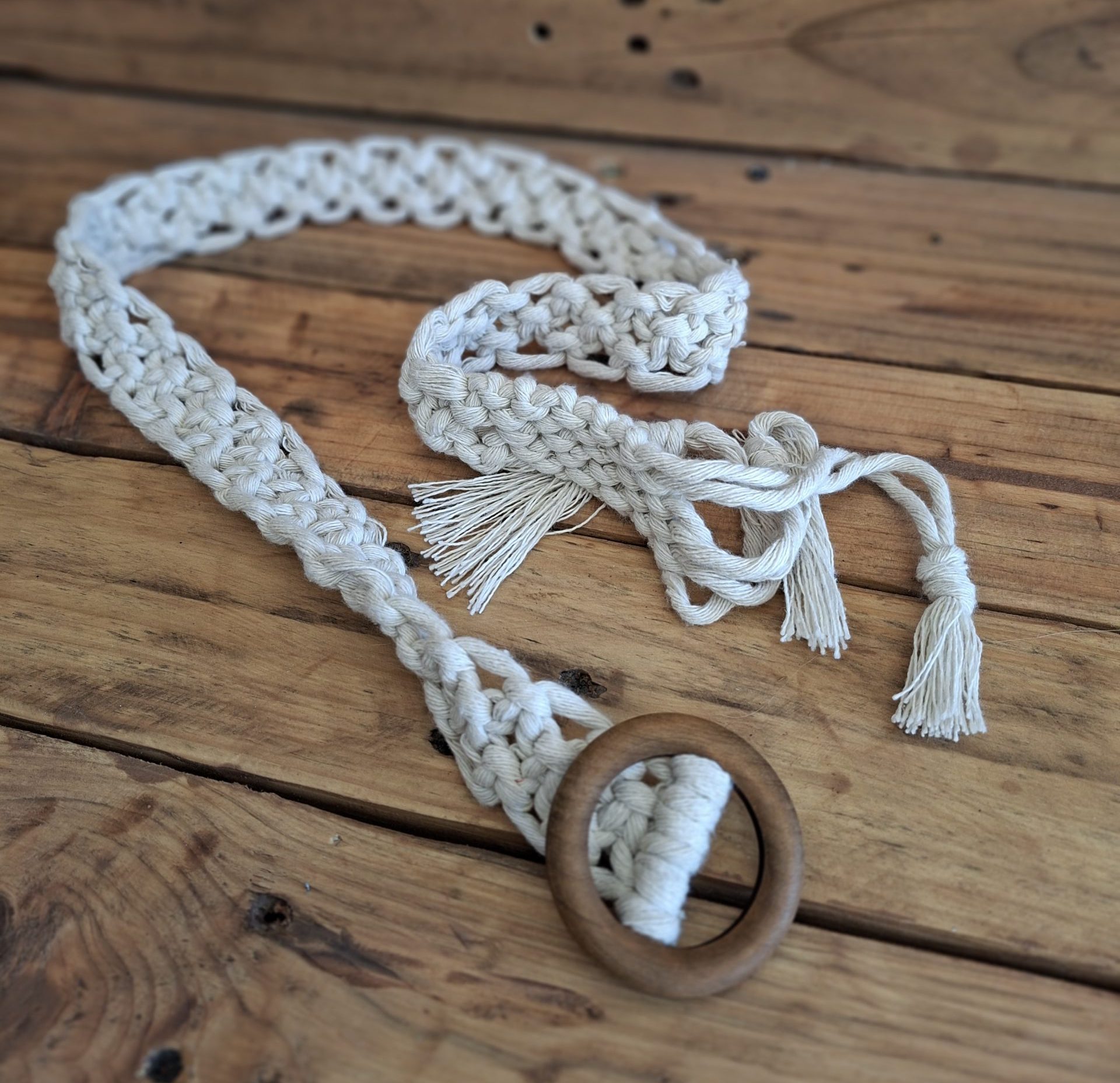Stylowy i minimalistyczny dodatek wykonany ręcznie techniką makramy. Ten biały pleciony pasek świetnie sprawdzi się jako element dekoracyjny do wielu kreacji. Dzięki solidnemu splotowi i drewnianemu kółku jest zarówno praktyczny, jak i estetyczny.
