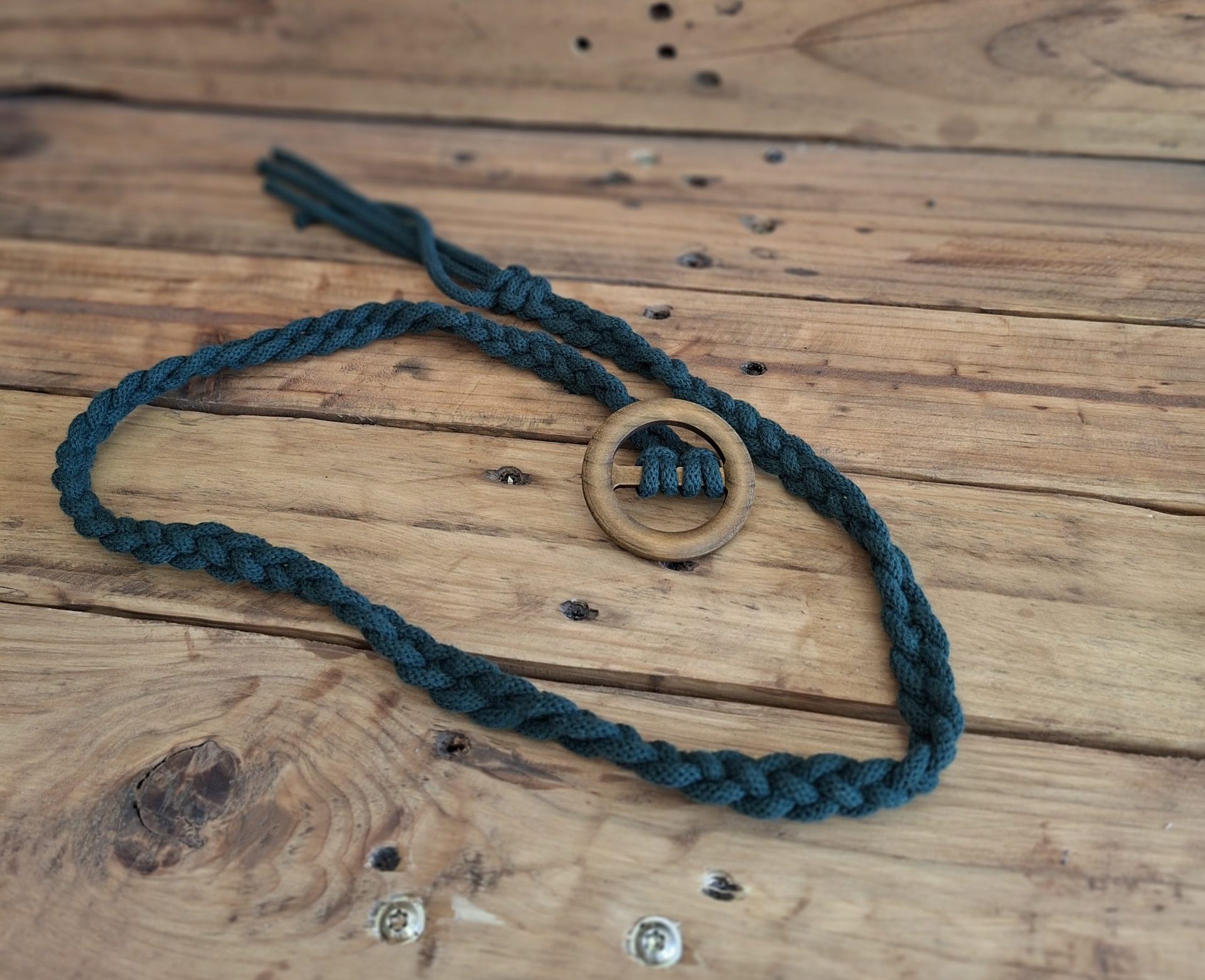 Stylowy i minimalistyczny dodatek wykonany ręcznie techniką makramy. Ten zielony pleciony pasek świetnie sprawdzi się jako element dekoracyjny do wielu kreacji. Dzięki solidnemu splotowi i drewnianemu kółku jest zarówno praktyczny, jak i estetyczny.