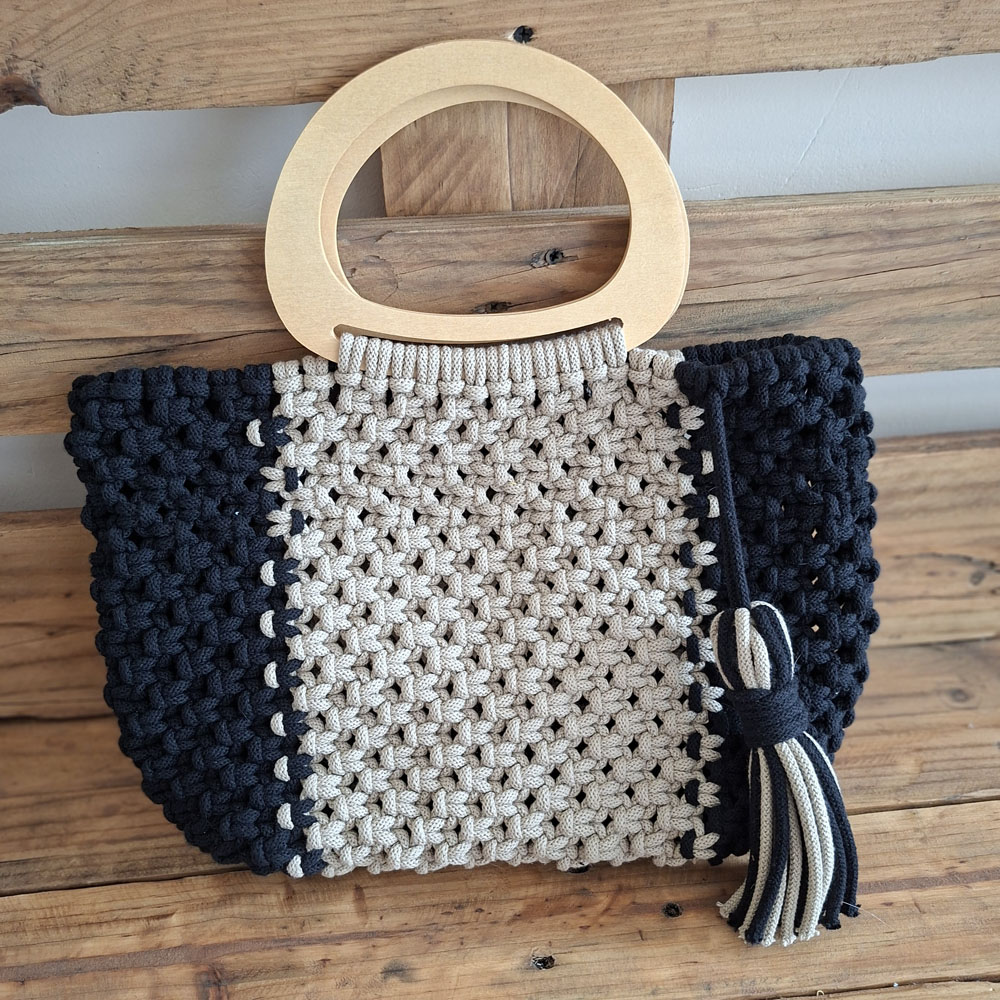 Dwukolorowa torebka makramowa handmade. Ręcznie pleciona torebka ze sznurka bawełnianego w dwóch odcieniach, ozdobiona eleganckimi drewnianymi uchwytami. Idealna do pracy, do codziennych stylizacji, czy na wyjście z przyjaciółmi. Stylowa i niepowtarzalna.