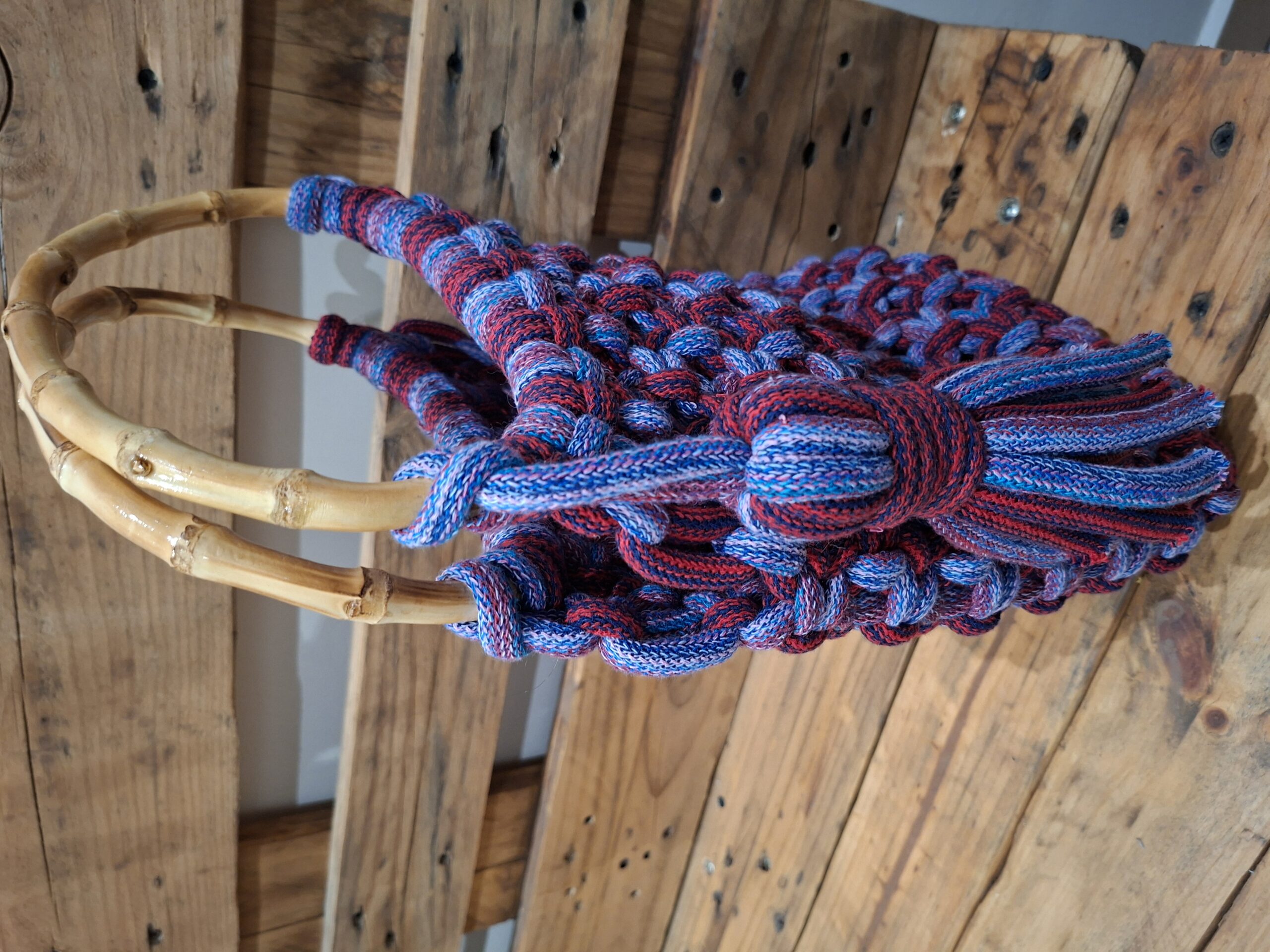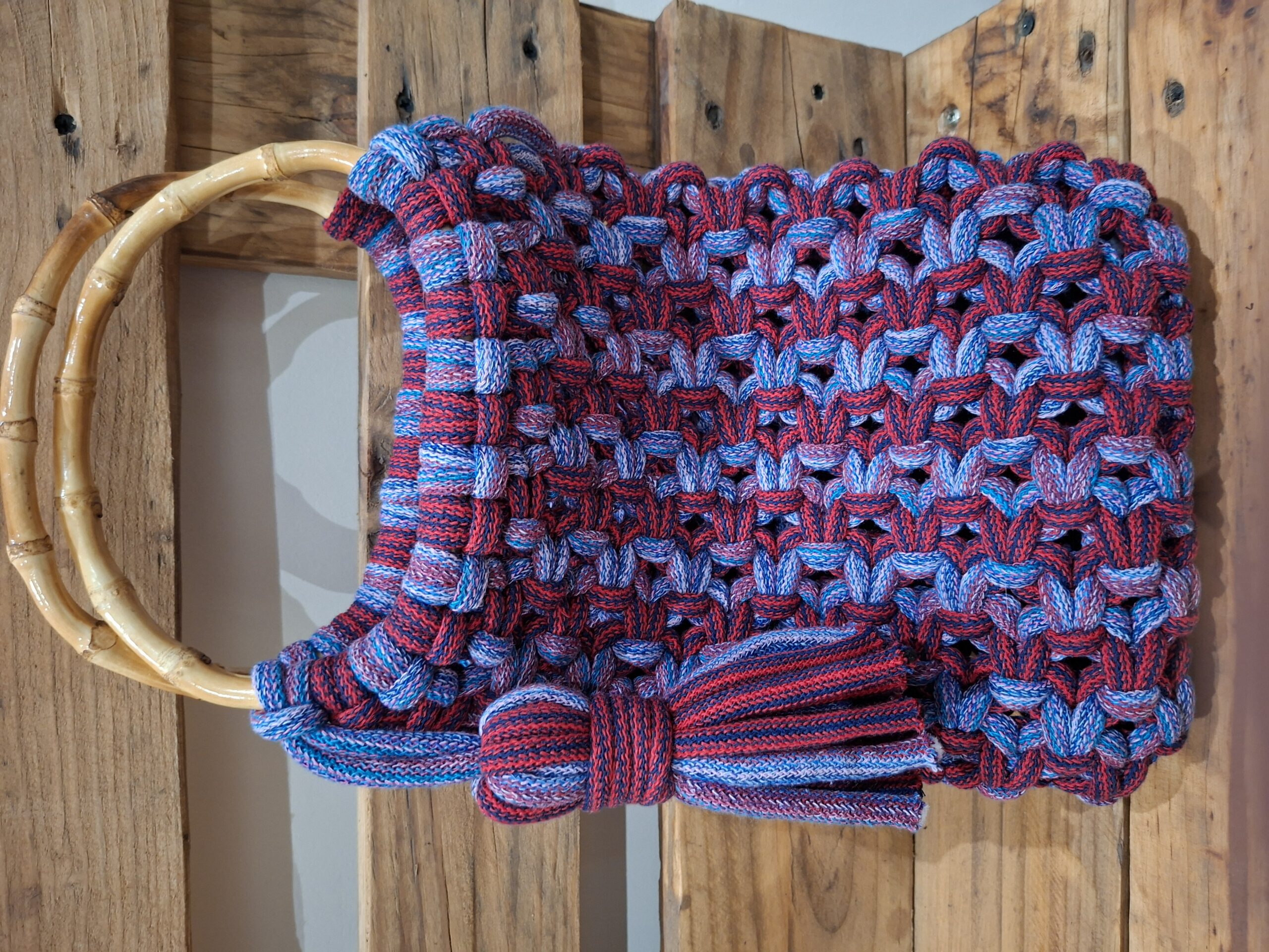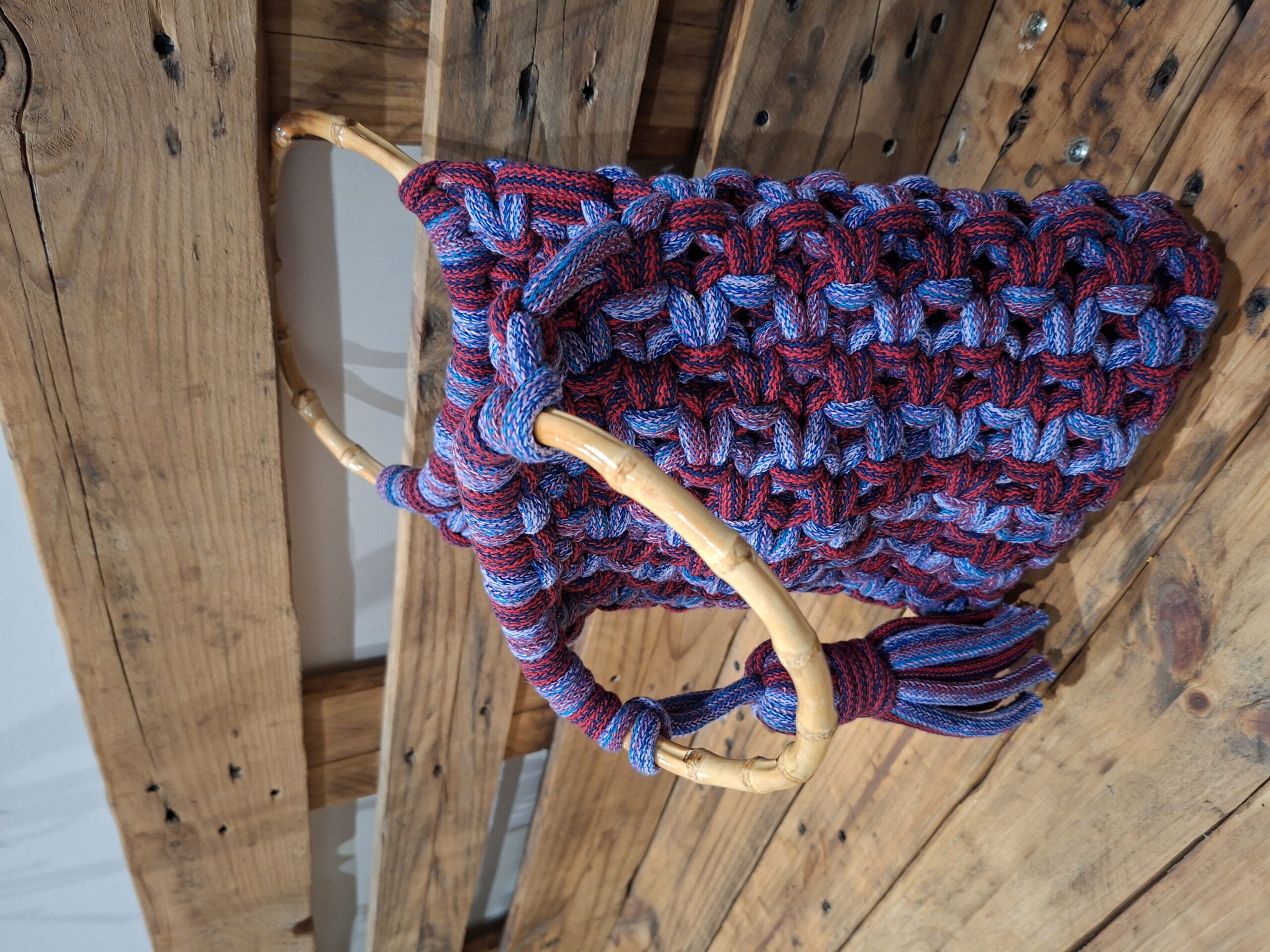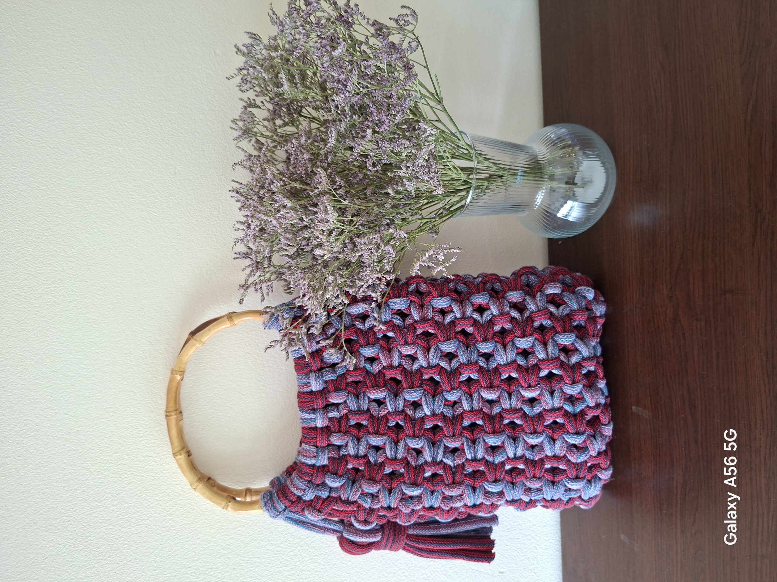 Odkryj wyjątkowe połączenie rękodzieła i naturalnego stylu. Ta torebka makramowa to doskonały wybór dla kobiet ceniących oryginalność, jakość i subtelny urok stylu boho. Ręcznie pleciona z wytrzymałego sznurka w odcieniach fioletu i niebieskiego, zachwyca precyzyjnym splotem oraz naturalnymi bambusowymi uchwytami, które dodają jej lekkości i elegancji. Ozdobny chwost nadaje jej niepowtarzalny charakter. Unikatowy design – każda torebka jest jedyna w swoim rodzaju. Idealna na spotkania i codzienne wyjścia. Naturalne materiały i trwałe wykonanie