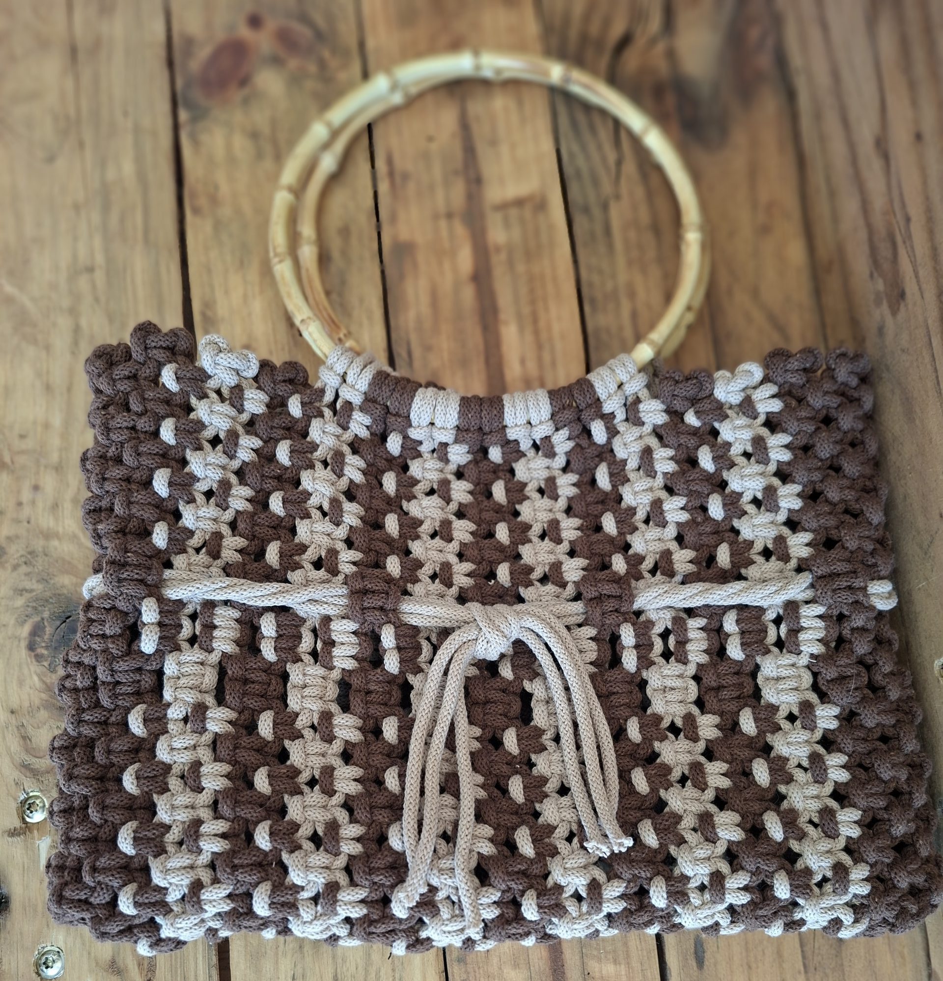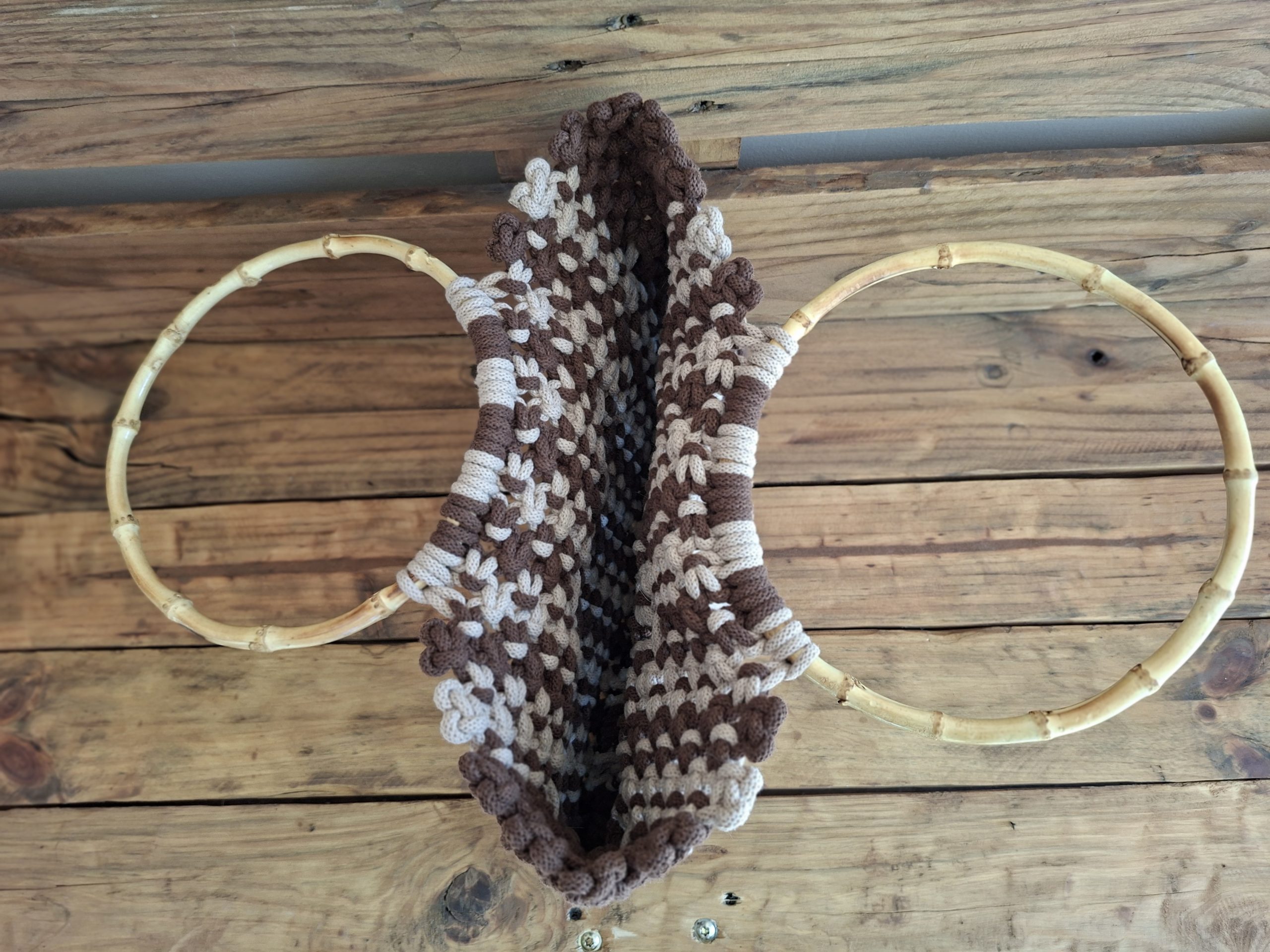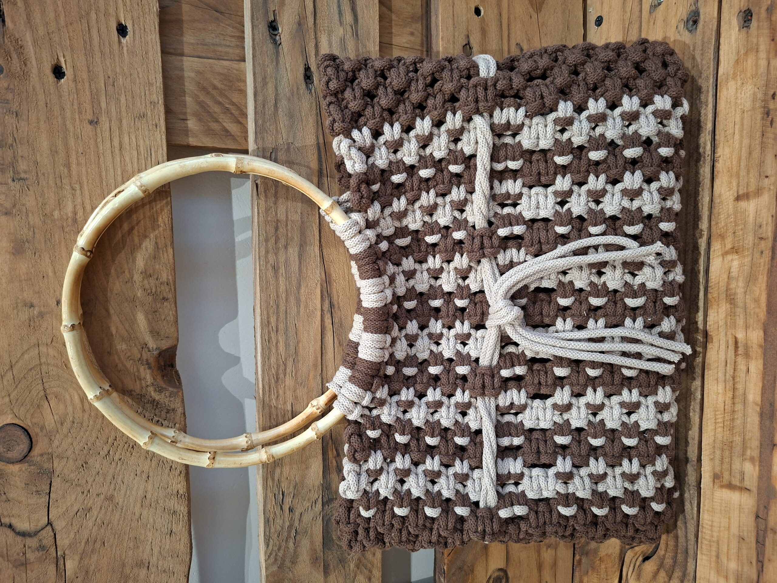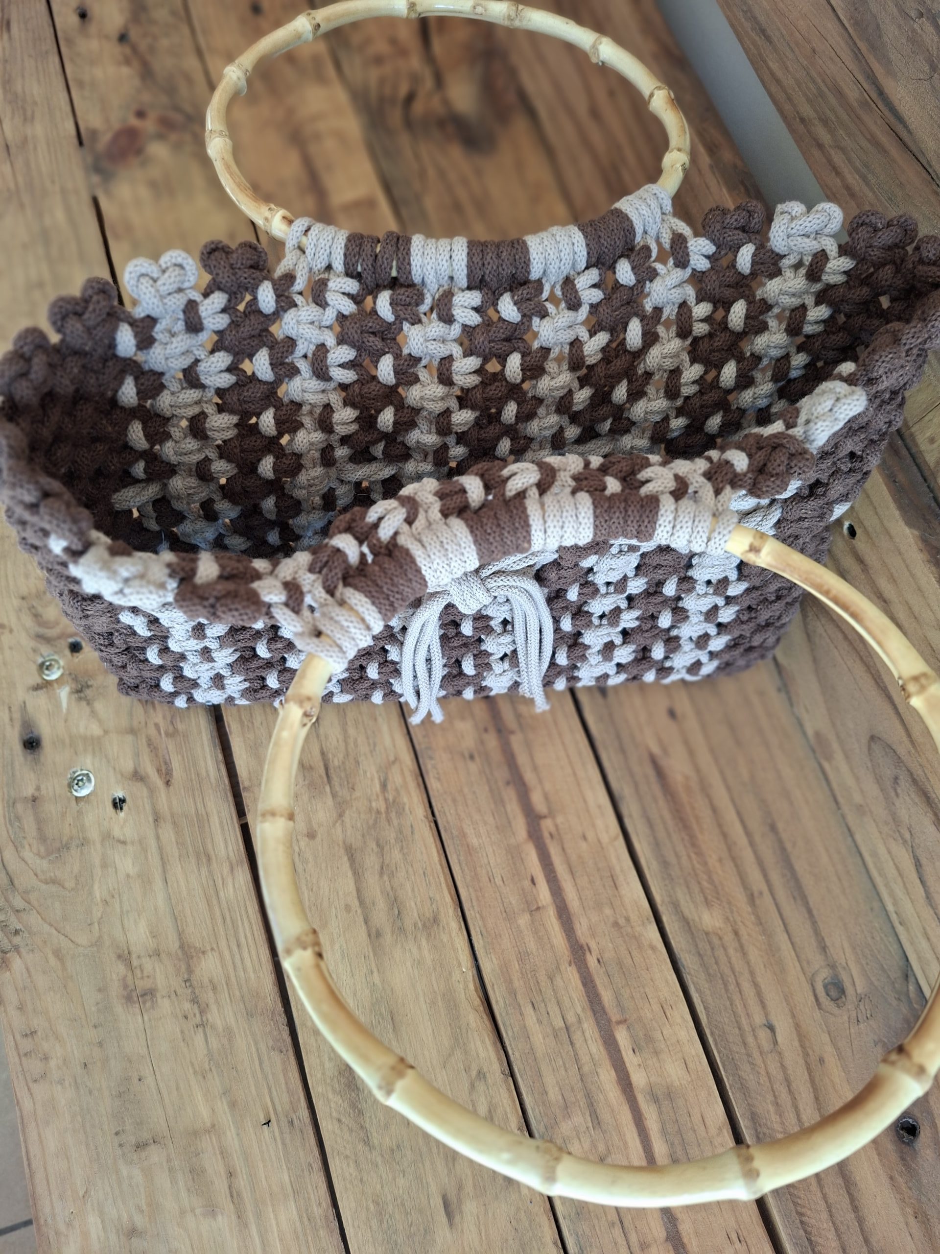 Stylowa i wyjątkowa torba wykonana techniką makramy z grubego, trwałego sznurka bawełnianego w odcieniach brązu. Naturalne uchwyty z bambusa dodają jej uroku i sprawiają, że idealnie pasuje do każdej stylizacji. Idealna do pracy, do codziennych stylizacji, czy na wyjście z przyjaciółmi. Stylowa i niepowtarzalna.