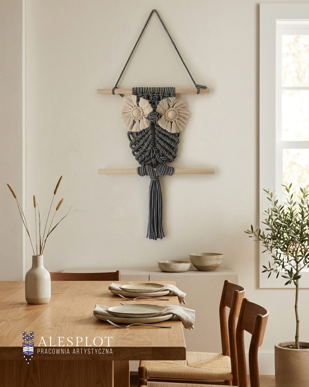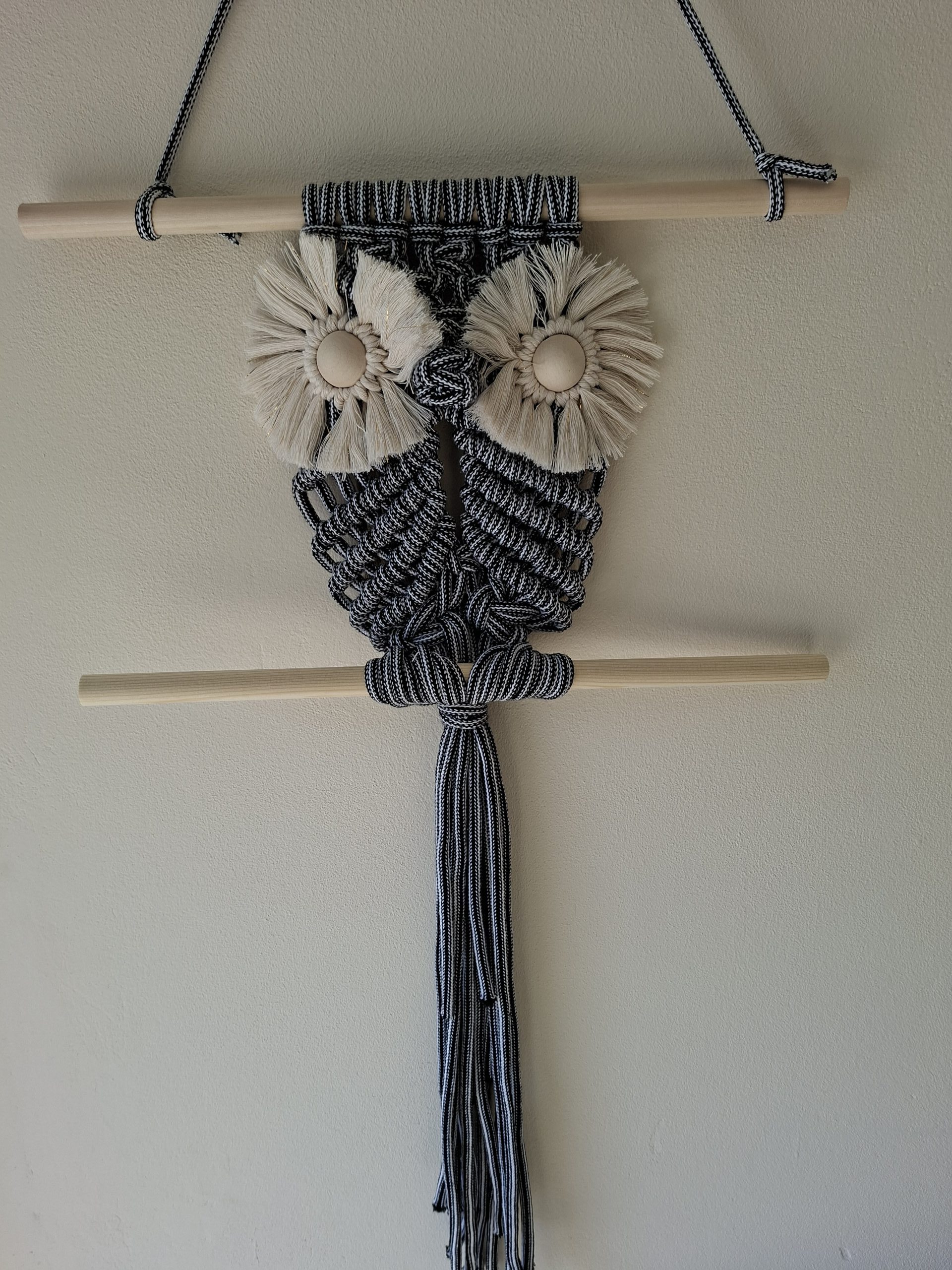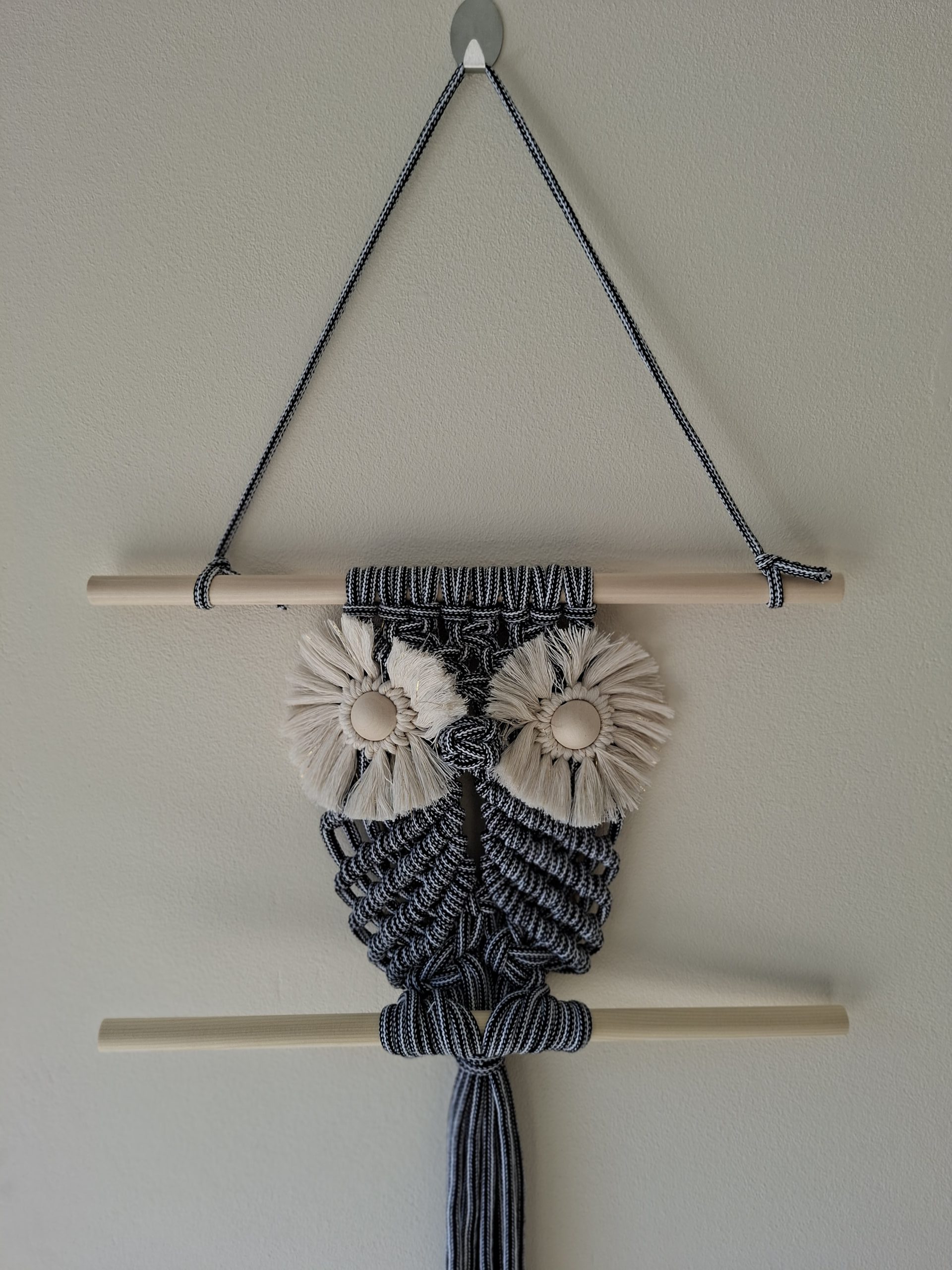 Stylowa sowa w klimacie boho, wykonana ręcznie z bawełnianego sznurka i drewnianych elementów. Idealna ozdoba do salonu, sypialni lub biura.