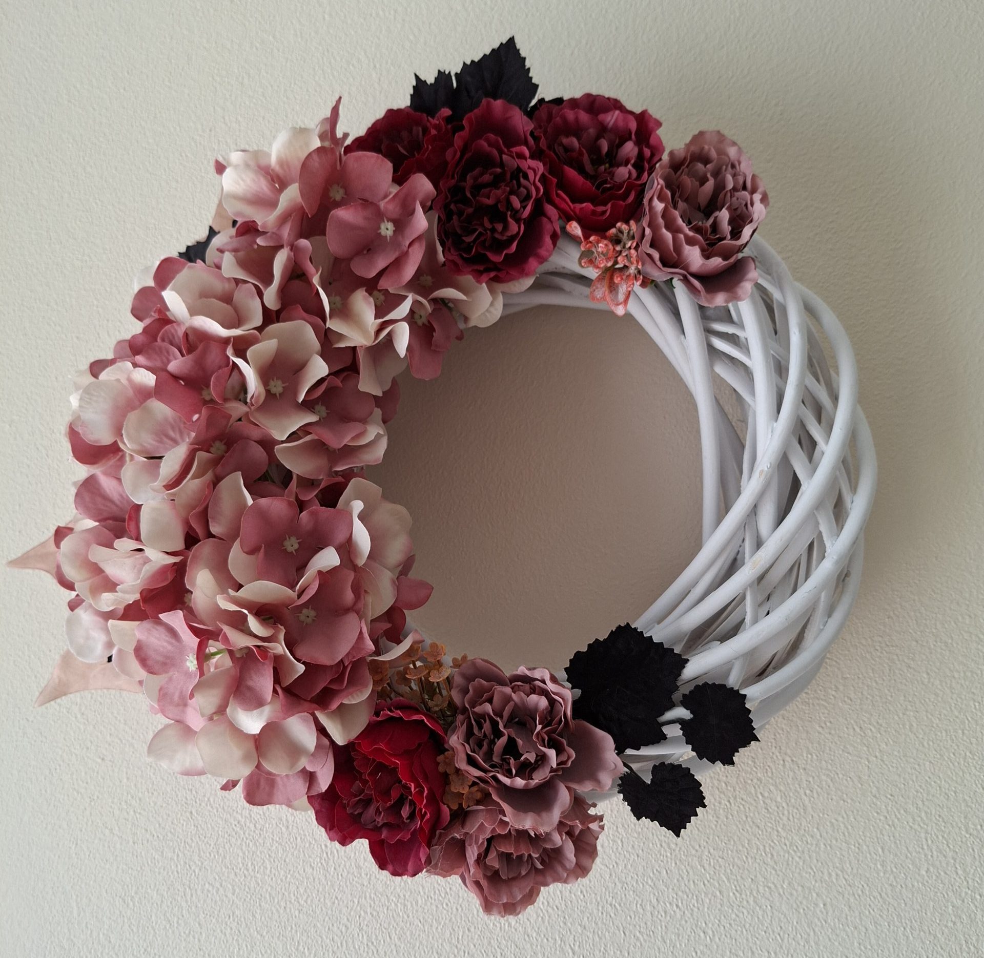 Wianek został wykonany ręcznie na plecionej, białej bazie, która stanowi doskonałe tło dla bogatych odcieni kwiatów – od pudrowego różu, przez malinę, aż po głęboki burgund. Kompozycję dopełniają ciemne liście i subtelne akcenty w postaci drobnych, dekoracyjnych elementów, które nadają całości harmonii i elegancji.