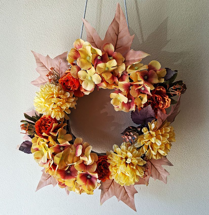 Wprowadź do swojego wnętrza ciepło jesieni! Ten piękny wianek z kwiatów i liści w odcieniach złota, pomarańczu i brązu to idealna dekoracja na drzwi, ścianę lub stół. Wykonany z najwyższej jakości sztucznych kwiatów — prezentuje się naturalnie i elegancko przez wiele sezonów.