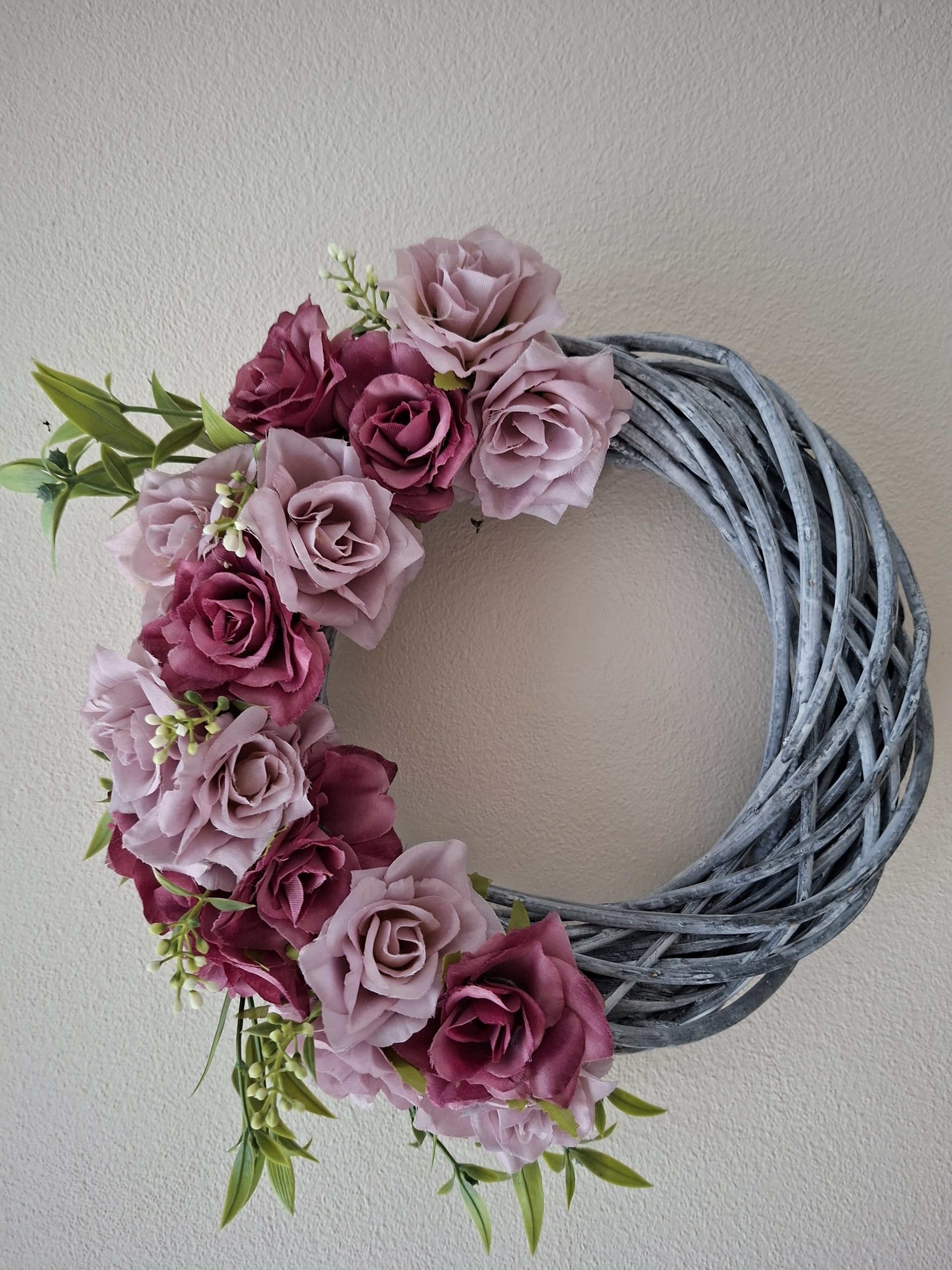 Ręcznie wykonany wianek o subtelnej, romantycznej kompozycji kwiatowej. Idealny do eleganckich wnętrz, salonów, sypialni lub jako delikatna ozdoba drzwi. Połączenie kwiatów w odcieniach pudrowego i malinowego różu z zielonymi akcentami tworzy harmonijną, przyjemną dla oka dekorację.